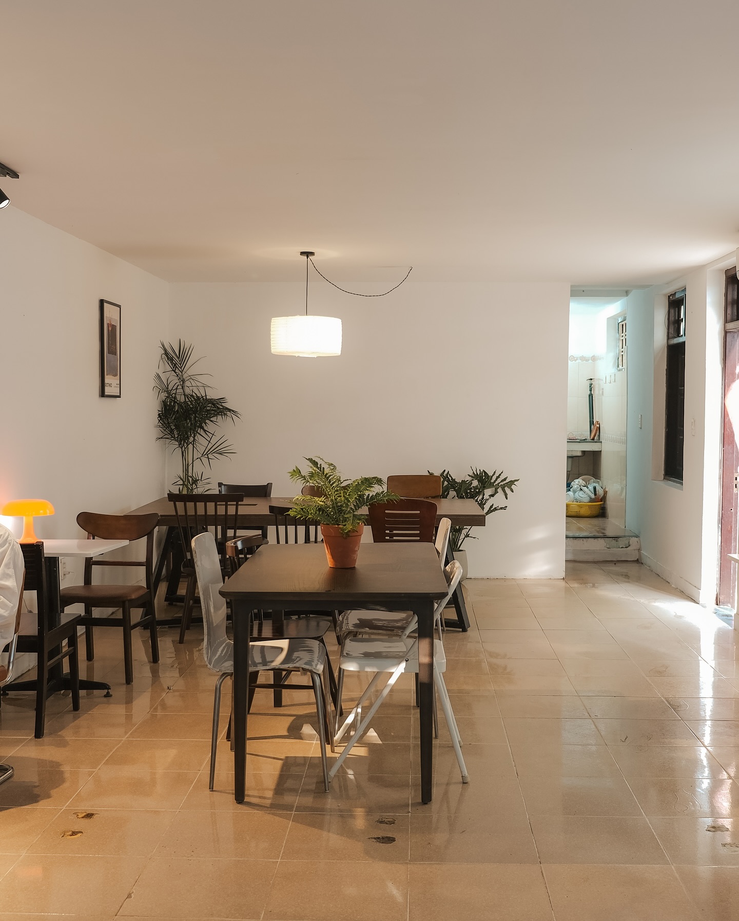 Quán sở hữu hai mặt tiền rộng rãi, được thiết kế theo phong cách tối giản, ngập tràn ánh sáng tự nhiên nhờ nhiều ô cửa sổ lớn. Không gian gồm hai tầng, với đa dạng lựa chọn chỗ ngồi trong nhà hoặc ngoài trời, rất phù hợp cho các buổi làm việc cá nhân, đọc sách hay trò chuyện nhẹ nhàng.